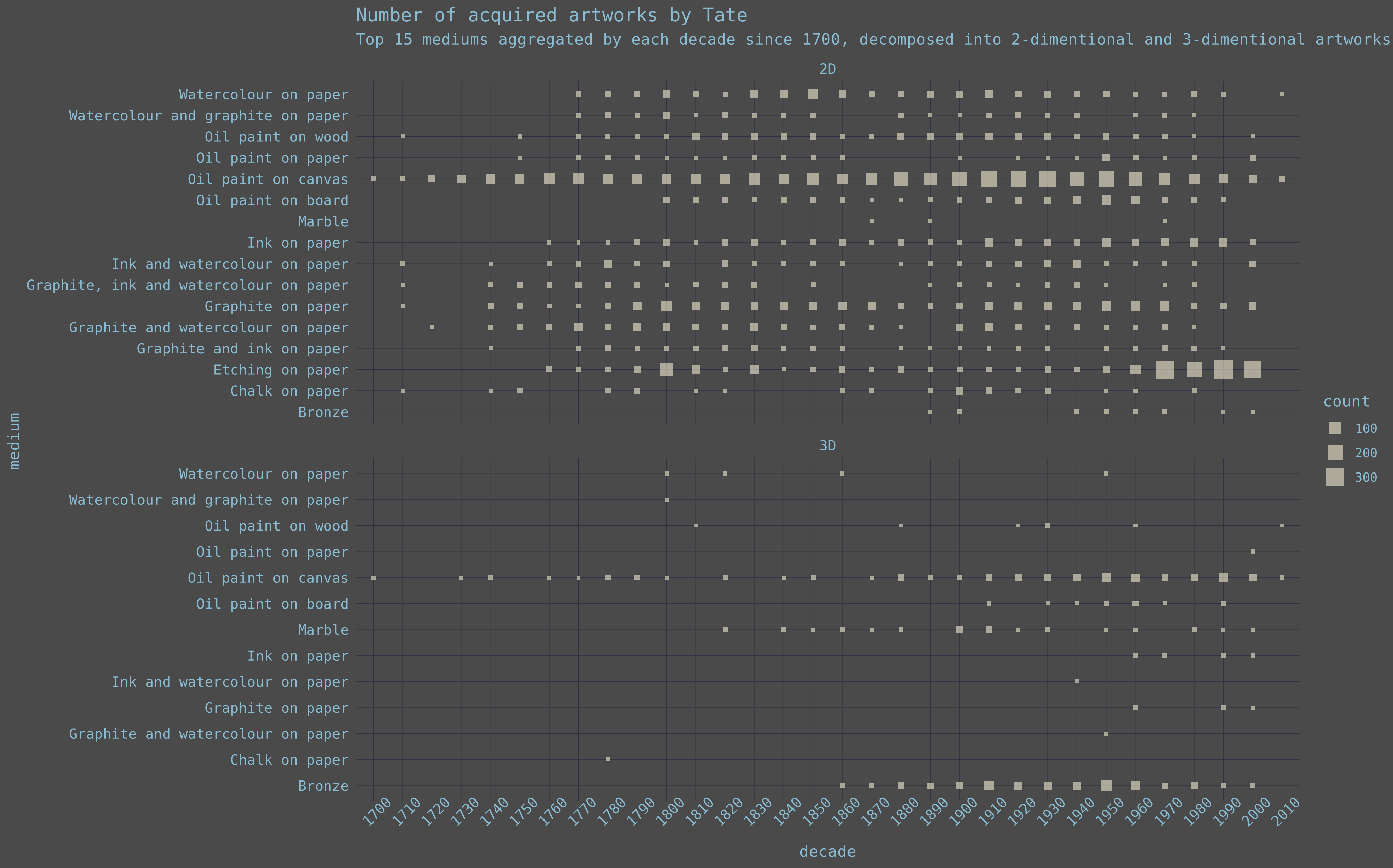 The main challenge from this week’s data is deciding the main angle of analysis, believe it ain’t simple, there has been lots of trials in this regard and decided to go with decomposing the artworks into two categories, 2-dimensional, and 3-dimensional, also I eliminated artworks by Turner, Joseph Mallord William for whom I will dedicate a specific analysis, here’s my take: